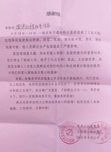 王墳鎮(zhèn)黨委及鎮(zhèn)政府為淄博金建星送來的感謝信