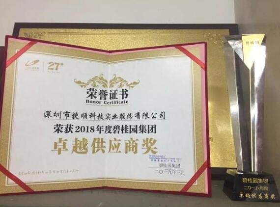 在今年參選的7151家合作供應(yīng)商中,捷順科技憑借高端的品牌實力、先進的產(chǎn)品理念、優(yōu)質(zhì)的服務(wù)水平,斬獲"2018年度碧桂園卓越供應(yīng)商"獎項,行業(yè)領(lǐng)軍地位再獲認可。