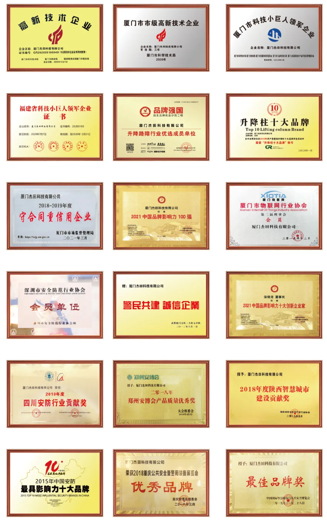 十五年來,公司不僅積累了豐富的經(jīng)驗,在行業(yè)內(nèi)擁有了良好的口碑,公司的發(fā)展也越來越好。目前,杰田科技擁有多項產(chǎn)品發(fā)明專利,30多個實用新型專利和10個軟件著作權(quán),多款產(chǎn)品通過了GA/T 1343-2016《防爆升降式阻車路障》公安部行業(yè)標(biāo)準(zhǔn)型式檢測報告,榮獲“廈門市高新技術(shù)企業(yè)”和“國家高新技術(shù)企業(yè)” “廈門市科技小巨人領(lǐng)軍企業(yè)” 和“福建省科技小巨人領(lǐng)軍企業(yè)”“ 廈門市守合同重信用企業(yè)”“2021中國品牌影響力100強” “中國升降柱十大品牌”等榮譽稱號。