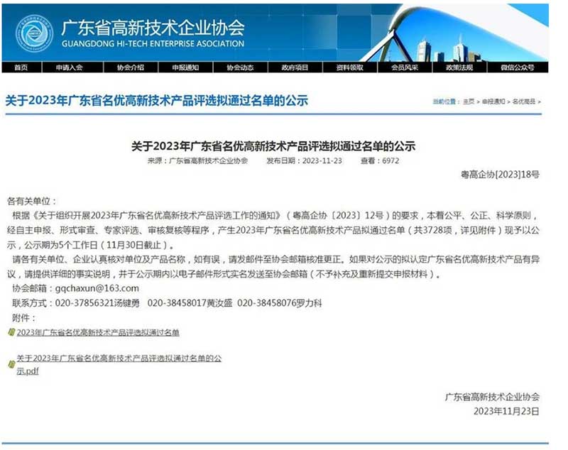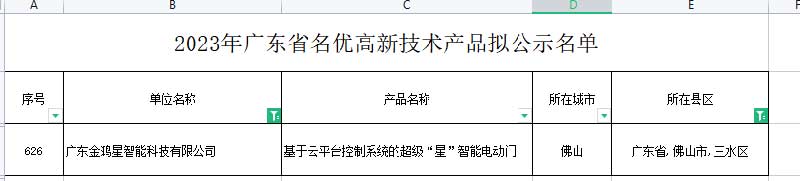 近日,廣東省高新技術企業(yè)協(xié)會公示了《2023年廣東省名優(yōu)高新技術產品擬通過名單》,廣東金鴻星智能科技有限公司研發(fā)的超級“星”智能電動門產品憑借卓越的創(chuàng)新和優(yōu)異的性能,成功入選目錄名單。