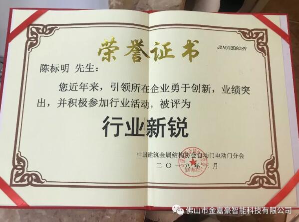 3月7日,2018全國(guó)自動(dòng)門電動(dòng)門行業(yè)年會(huì)頒發(fā)“行業(yè)新銳”榮譽(yù)證書和頒獎(jiǎng)留念