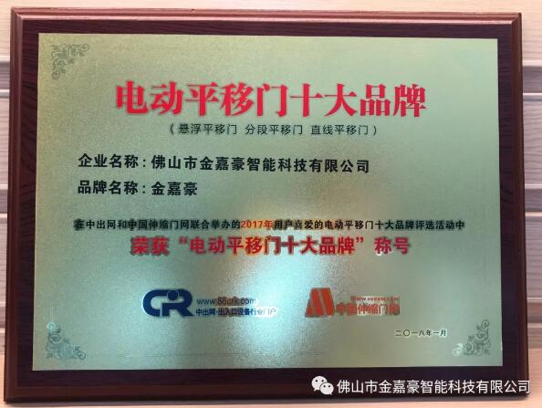 金嘉豪榮獲電動(dòng)平移門十大品牌