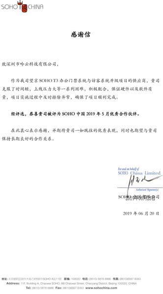 昨日,令令開門收到一封特別的感謝信。SOHO中國(guó)致謝令令開門,并評(píng)選令令開門為SOHO中國(guó)2019年5月優(yōu)秀合作伙伴。