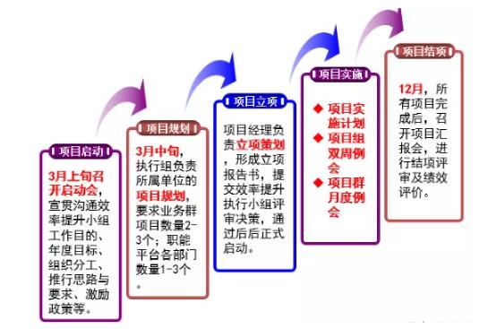 公司成立了效率提升小組,全面把控優(yōu)化方向,提升項目推進的力度和廣度。其中,效率提升領(lǐng)導(dǎo)組負責(zé)項目年度計劃、激勵方案和評價結(jié)果的審批,以及升級問題的解決;下設(shè)效率提升執(zhí)行組,負責(zé)編制項目年度計劃、激勵方案、項目績效評價方案,審批項目立項和高階方案,項目群管理和項目賦能等。此外,執(zhí)行組任命四個流程優(yōu)化項目組成員,負責(zé)具體項目執(zhí)行,包括項目立項、方案設(shè)計、方案開發(fā)(涉及IT)、測試驗證(涉及IT)、方案推行、項目結(jié)項。