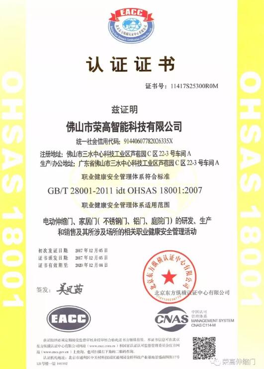 品質(zhì)的強(qiáng)化管理是榮高智能門窗獲得認(rèn)證證書的根本要素。我們將不斷提高公司質(zhì)量和環(huán)境、職業(yè)健康安全管理水平,為公司提供管理保障。