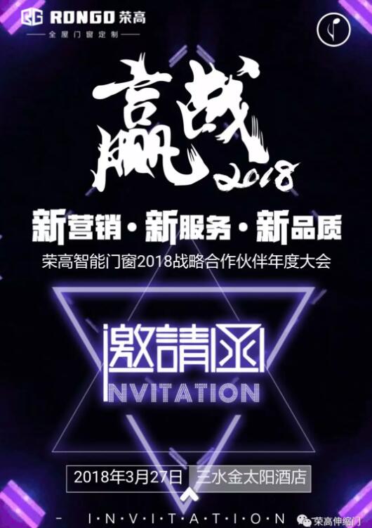 榮高智能門窗將于3月27日在佛山三水金太陽酒店舉行榮高智能門窗2018戰(zhàn)略合作伙伴年度大會,這場盛宴將帶來一波顛覆性的“干貨”。