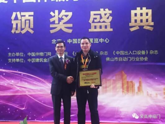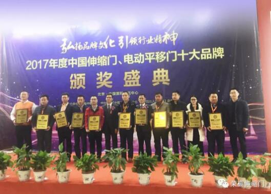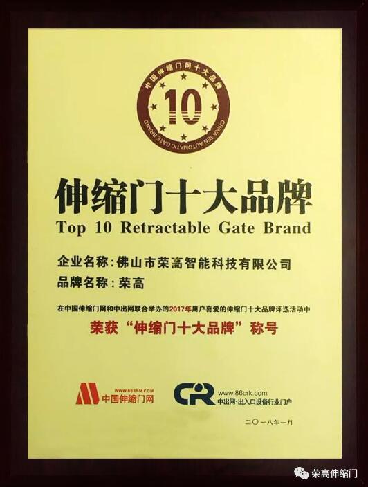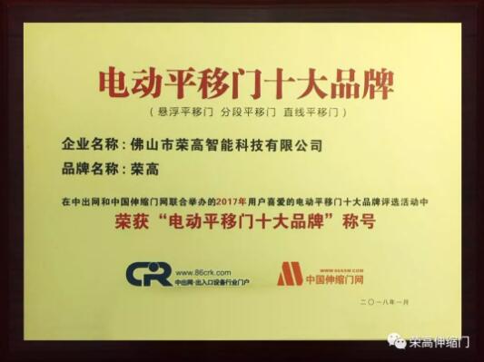 2018,狗年開門紅!3月9日,榮高智能門窗應邀參加第一屆中國(北京)電動圍墻門科技成果發(fā)布會暨2017年度中國伸縮門、電動平移門十大品牌頒獎盛典。榮高智能門窗再次斬獲“伸縮門十大品牌”、“電動平移門十大品牌”兩大殊榮。