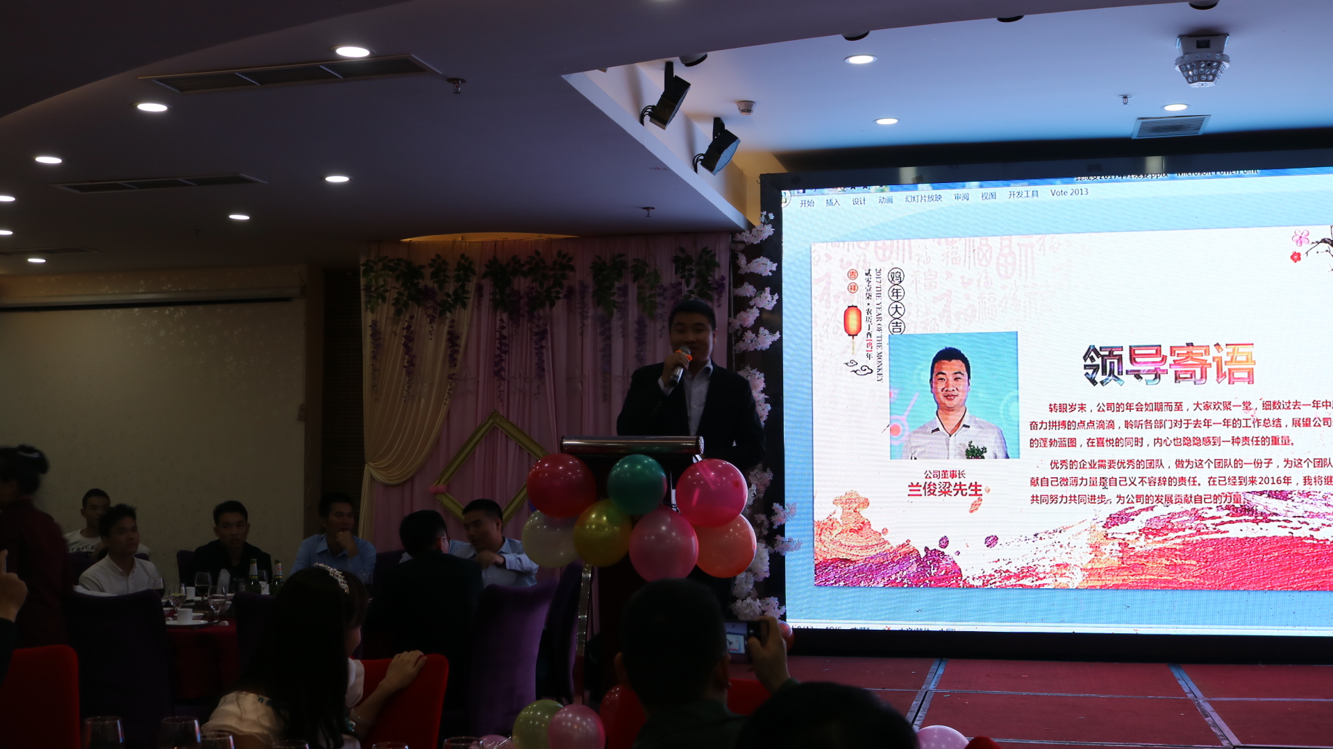 蘭總致辭:轉眼歲末,公司的年會如期而至,大家歡聚一堂,細數(shù)過去一年中風雨同舟奮力拼搏的點點滴滴,聆聽各部門對于去年一年的工作總結,展望公司未來發(fā)展的蓬勃藍圖,在喜悅的同時,內(nèi)心也隱隱感到一種責任的重量。