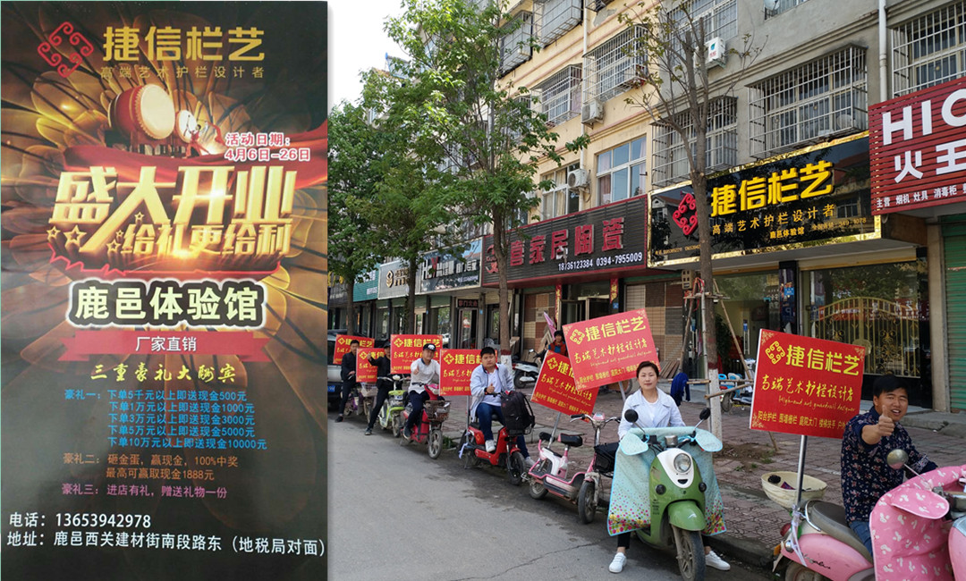 4月18日,在被譽為“中國老子文化之鄉(xiāng)“的河南省鹿邑縣,深圳市捷信欄藝鹿邑體驗館盛大開業(yè);鹿邑體驗館程總與公司總部的拓展團隊和業(yè)務經(jīng)理楊經(jīng)理以及程總多位朋友嘉賓出席了店慶開業(yè)儀式,在開業(yè)期間體驗館推出了多項優(yōu)惠活動;標志著開啟河南鹿邑縣陽臺護欄的藝術盛宴,為客戶提供家居安全與美學設計的整體一站式解決方案。