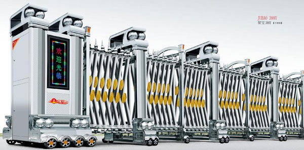 銅川伸縮門就是門體可以伸縮自由移動(dòng),來控制門洞大小、來控制行人或車輛的攔截和放行的一種門。伸縮門主要由門體、驅(qū)動(dòng)電機(jī),滑道、控制系統(tǒng)構(gòu)成。門體采用優(yōu)質(zhì)不銹鋼及鋁合金專用型材制作,采用平行四邊形原理鉸接,伸縮靈活行程大。驅(qū)動(dòng)器采用特種電機(jī)驅(qū)動(dòng),蝸桿蝸輪減速,并設(shè)有自動(dòng)離合或手動(dòng)離合器,自動(dòng)離合停電時(shí)可自動(dòng)啟閉,手動(dòng)離合停電時(shí)可手動(dòng)啟閉,控制系統(tǒng)有控制板,按鈕開關(guān),另可根據(jù)需求配備無線遙控裝置。