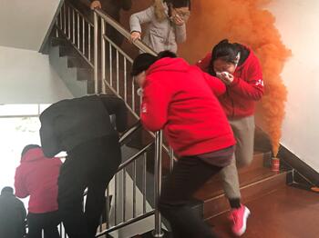 煙霧四起,各部門(mén)主管協(xié)助各樓層負(fù)責(zé)人引導(dǎo)員工開(kāi)始向疏散走道、安全出口部位有序疏散。