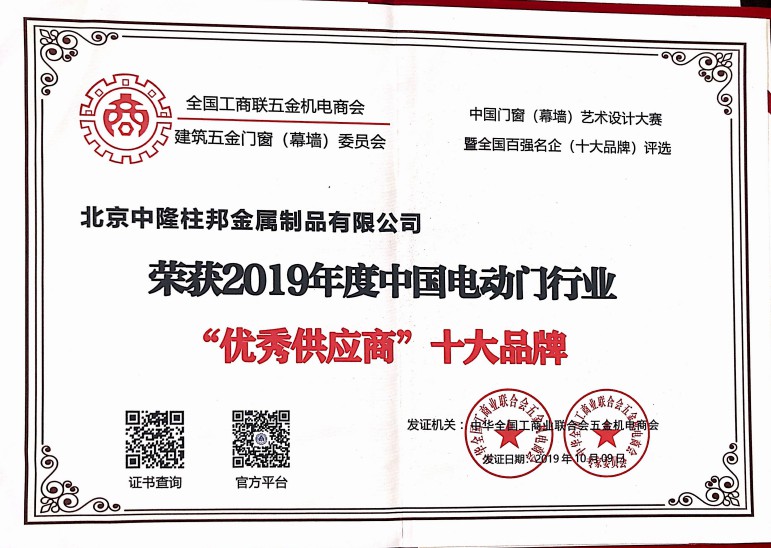 公司通過ISO9001--2008質(zhì)量體系認證,先后獲得全國房地產(chǎn)總工工作委員會頒發(fā)的【全國房地產(chǎn)總工優(yōu)選品牌】,門窗五金協(xié)會頒發(fā)的電動門行業(yè)的【全國伸縮門、推拉門十強企業(yè)】,【優(yōu)秀工程十大品牌】,【優(yōu)質(zhì)產(chǎn)品十大品牌】,【優(yōu)秀供應(yīng)商十大品牌】,【企業(yè)質(zhì)量信用AAA等級】等。
