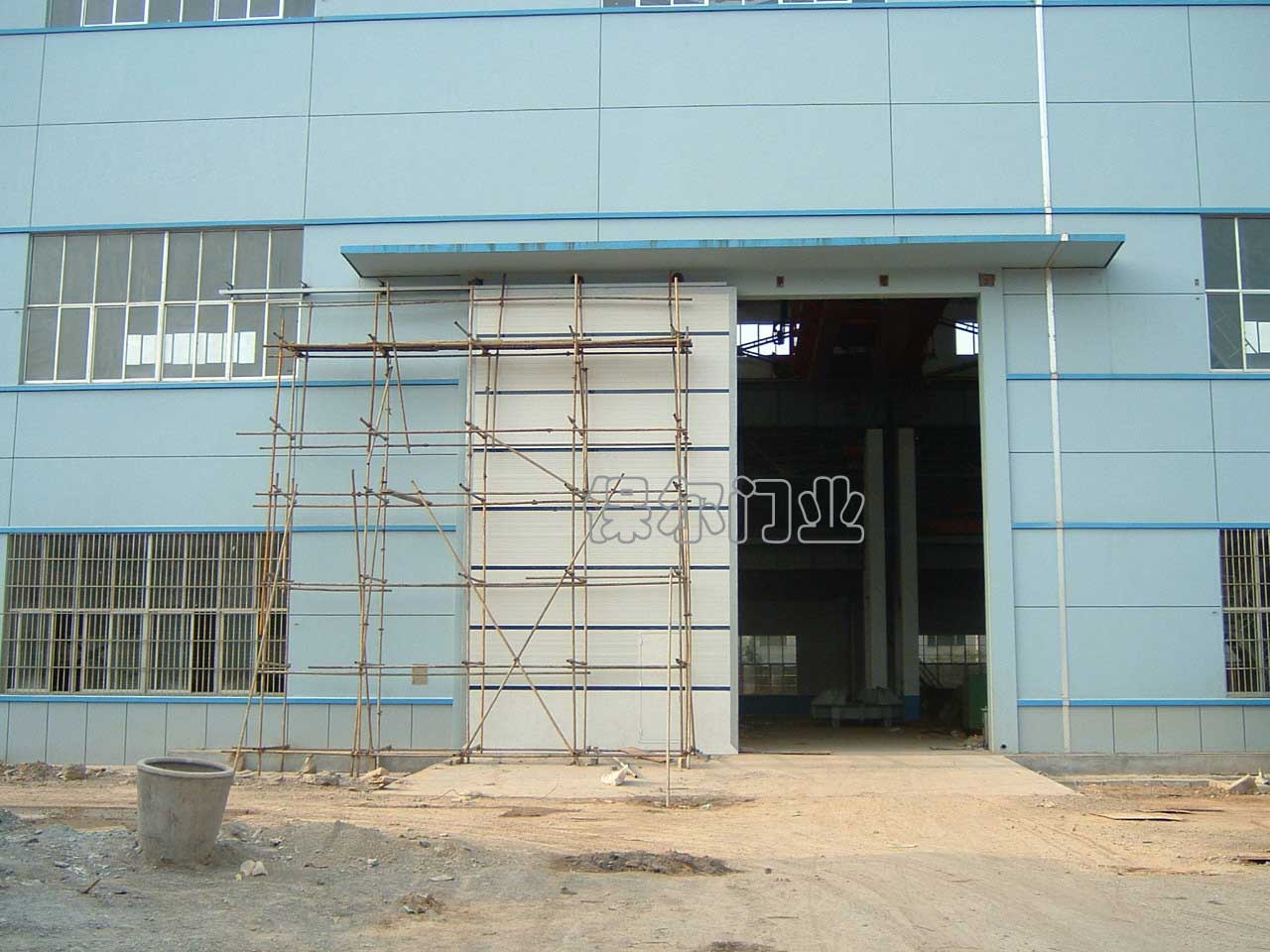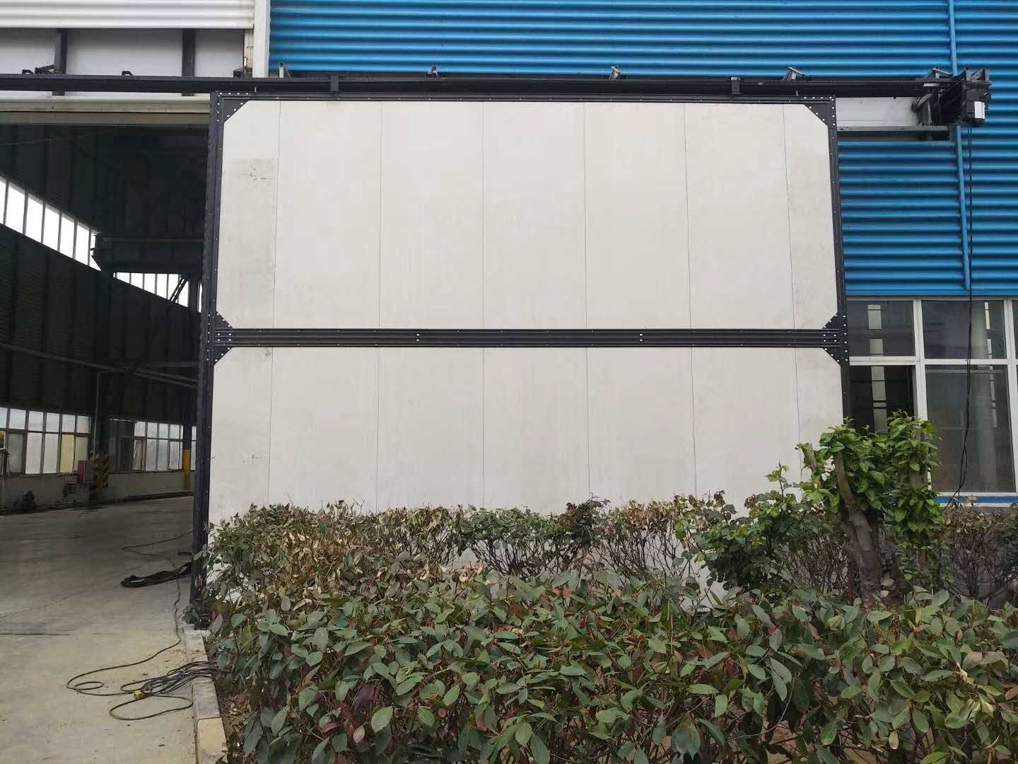 平移式工業(yè)門在門洞上下裝有導軌,門扇置于兩道軌中間,通過齒輪傳動,實現(xiàn)左右啟閉。平移方式的工業(yè)門對建筑上下空間限制小,但要求門洞左右兩邊有足夠的空間放置門體,啟閉平穩(wěn)可靠,手動輕松自如。一般用于倉庫、工業(yè)廠房