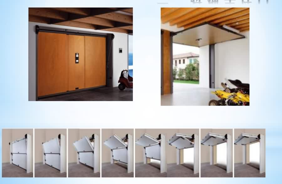 無(wú)軌車庫(kù)門是翻板車庫(kù)門的一種,所有機(jī)械裝置、驅(qū)動(dòng)裝置都隱藏在門體上方及左右兩側(cè),開(kāi)門機(jī)轉(zhuǎn)動(dòng)帶動(dòng)機(jī)械移位,門體上方開(kāi)啟。無(wú)軌車庫(kù)門安裝便捷,因?yàn)闆](méi)有彎軌和牽引軌道,車庫(kù)內(nèi)整潔,美觀,特別適用于車庫(kù)條件有限,豪華裝修的高端用戶