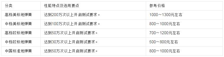因為用于雙向開門的地彈簧要承載門體的重量,比較閉門器而言,門體的重量對地彈簧的選擇起決定性作用。在實際應用中,門扇重量一般都不會超,所以門寬和風壓對地彈簧型號的選擇就是首選因素。另外還要注意縱橫比,即高度和寬度的比例,如果太不成比例,門扇也是無法正常使用的。從制作的角度看,地彈簧的蝸輪結構使彈簧的壓縮程度比齒輪齒條傳動的閉門器小,地彈簧關門的力臂也短,所以地彈簧的質量對結構設計和加工精度的依賴性更高。另外,由于雙向開門的門扇沿門扇平面對地彈簧有很大的作用力,所以低檔地彈簧的使用壽命與高檔地彈簧的差距會很大。